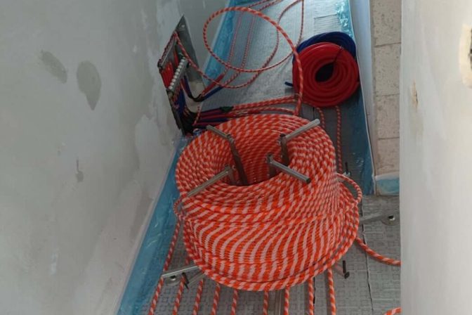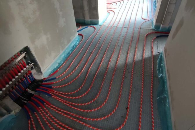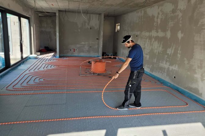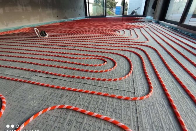 Montáž podlahového kúrenia v novostavbe v obci Nová dedinka. 195m2 podlahového vykurovania s použitím systému REHAU SPEED, vhodného najmä pre použitie anhydritového poteru.