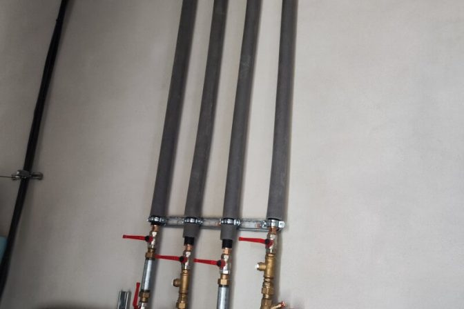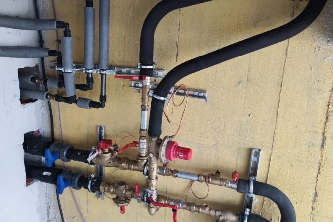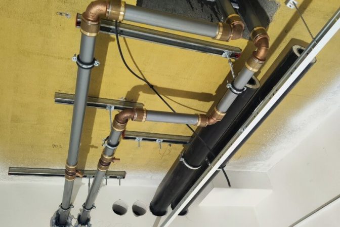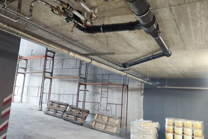 Rozvody úžitkovej vody (studená, teplá, cirkulácia) v suteréne z nerezových
